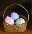 Put the eggs in a cute little basket, or on an egg stand. Napkin rings make good egg stands, or you can make one from clay as shown in the photo. Cut two discs or flowers from clay, stack them, then press a real or plastic egg into the top to make an impression for the clay egg to sit in.