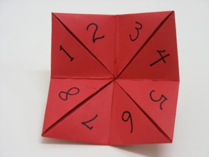 Now you are ready to “play the game.” Put your fingers in the 4 pockets and hold them in the shut position. Ask another person to choose one of the 4 words or numbers.