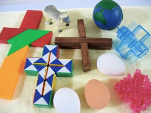 Since the motivation for these gifts is to help your children grow spiritually, they will probably not get as excited about these gifts as they would Christmas presents. So it’s good to include some frivolous things that they can get excited about. I tried to find a new cross puzzle every year for my children, and surprisingly, the 100 yen stores obliged quite well--all the items pictured here, except the globe ball, were purchased at 100 yen stores. The rubber eggs are a lot of fun, too, since they can fool their friends with them, and the eggs bounce every which way since they are not round like regular balls. They even make egg relay games an indoor option. My 16 year old son was delighted to see our rubber eggs again this Easter season, since he had taught himself to juggle with them. Silly putty that comes in an egg shaped case, is always fun, too.A chocolate cross or lamb (or bunny) will always bring a smile. Craft sets, and and Bible games would be good choices as well. At the end of the Easter season, I put all these away with the Easter decorations, so that when the Easter season began the following year, there were fun things to do, and the toys almost as good as new presents, since they had not seen them for a whole year.