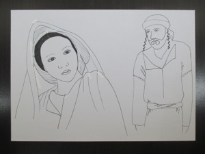 This picture depicts Joseph deciding to quietly put Mary away rather than marry her. Note: Use wisdom about whether to use this part of the story or not--for younger children, it may be better to leave off this picture, as it could bring up some awkward questions you may not be ready to answer.