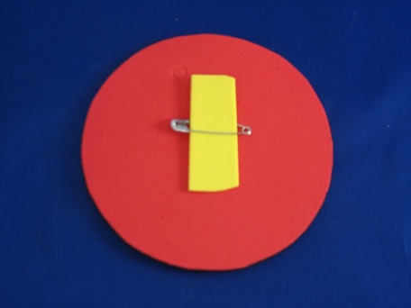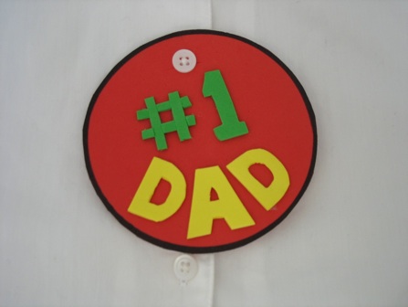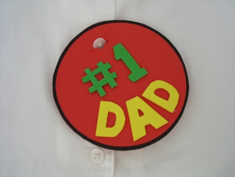 4.There are 3 ways to fasten on the badge. a) use double stick tape to fasten it on to Dad’s shirt, or b) Glue a safety pin to the back, or c) make a button hole: use a paper hole punch to punch a hole in it, then cut a slit on either side so the slit is as wide as the button on Dad’s shirt. Slide the hole over a button on Dad’s shirt. See photos below
