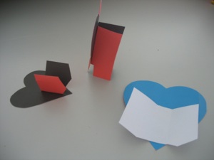 3.Glue magnets or paper stands to the backs of the base cards. To make a stand, cut a rectangle of paper that is about 3/4 the size of the heart--it doesn’t have to be exact--you just don’t want it to show from behind the heart. Fold it in 2 places so that the middle is about a half inch wide (1 cm.) Glue it to the back of the heart. Trim the bottom sides of the 2 side flaps at a slight angle to make the heart tip back slightly, otherwise it will tend to fall forward. If you don’t want the stand to show, you can cut out a small section that is behind the point of the heart (see photo on left.)