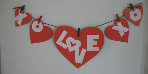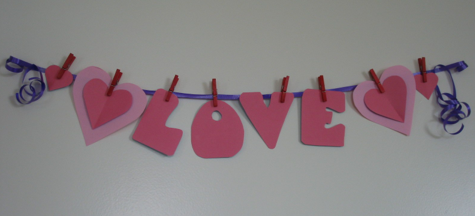 These decorations are short enough to fit on doors, refrigerator, cupboards, bathroom mirror, or bunk beds. But don’t be limited to the word “love”--there are all kinds of phrases that might be fun to decorate with--”I am wild about you,” or “I think the world of you,” or “I have a soft spot for you,” or “I am hooked on you,” or “I get a kick out of you.” “Happy Valentine’s Day” is always a good option, too.