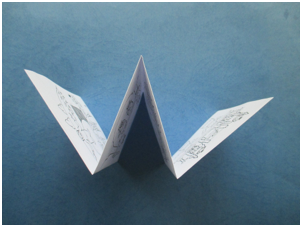 The booklet starts on one side, then continues on the back. Another option would be to cut the printed sheet in half instead of folding it in half. Then tape the 2 strips end to end, and accordion fold the booklet pages all the way to the end.