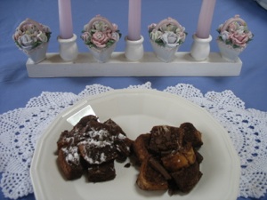 This is really a glorified french toast, so it’s quick. Mix cocoa and sugar in with the milk and eggs. But instead of dipping the bread in the egg mixture, cube the bread, mix it in the egg mixture. Scoop it out with a measuring scoop or large spoon onto a baking sheet--plan on one or two per person. Sprinkle with sugar and grated chocolate or chocolate chips. (The sugar makes the top nice and crispy as it bakes.) Bake for about 10-15 min, (depending on the size). in a 350 degree F oven, or until the tips that stick up are crispy. Sprinkle with powdered sugar or chocolate syrup or just eat plain. For a casserole version, dump it all into a casserole, but it will take about a half hour to bake.