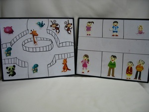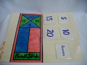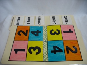 Draw a Ping-pong table onto a file folder or a piece of cardboard. Use 2 plastic buttons or discs for the ball. Make one button jump over the “net” by pressing the edge of the button with anther button. Where the button lands determines the number of points awarded. This game is best used with a small class. If you want to do this with a large group, make several sets and divide the children into small groups.