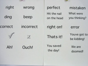 Make sure all your questions are in the True/false format. This sounds more complicated than it is, so I will try to keep the instructions from getting complicate. it is well worth the effort because kids really do enjoy seeing the answers. The answers are just different ways to say right, or wrong, but each one is different, so each one is a surprise. You can download the ones shown above, or you can make up your own (a thesaurus comes in handy for finding right and wrong synonyms.) Just so you don’t get confused, first, hang all the true cards in a column on the left, and all the false cards in a corresponding column on the right (shown in left photo above.) Now hang the “correct” cards for each question on top of the true or false card--on top of the true if the answer to the corresponding question is true, or on the false if the answer is false. Now put all the “wrong” cards in the empty spots. If you leave it like this, all the answers are showing, so now put the True and False cards on top so the answer does not show--just a column of true cards, and another column of false cards (It should look like the photo on the left again.) Now you are ready to play the game. Ask a team the first question, and have them decide whether the answer is true or false. If they choose true, let them take off the true card to see if they got the answer right. If they chose false, let them take off the false card to see if they got the answer right. Since each “right” and “wrong” card is different, the kids really think it is fun to see what the word is going to be, and they always want to see what the “wrong” card says, too. Warning: if you make all the answers true, or all the answers false, the kids will figure it out pretty quickly, so be sure to mix it up.