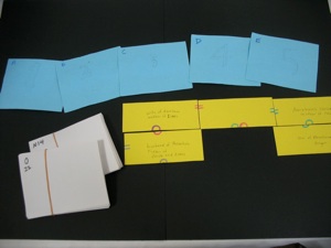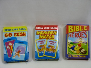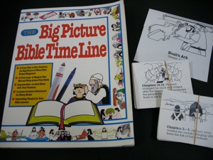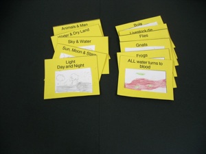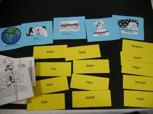 The cards in the photo above were purchased at an American Dollar store. You can make your own by photocopying pictures in books such as Big Picture Bible Time Line, and gluing them to card stock or covering with clear plastic sheets (contact paper) or laminating them.