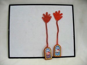 Buy these sticky hands in the toy section of hundred yen stores, or buy “Iky poo” in toy stores in America (Iky Poo does not have hands, but work just as well.) Make cards (see ideas below)