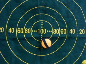 Glue the “claw” side of velcro in two strips around a ping-pong ball (both can be purchased at 100 yen stores.) Draw a fun target onto a piece of felt (also sold at 100 yen stores) and mark different parts of the design with various point values. Hang the felt target in the classroom.