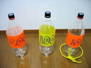 Tie rope into rings. Hold the knot to throw. Use plastic pop bottles (pet bottles) as targets. Mark the bottles with different points values.