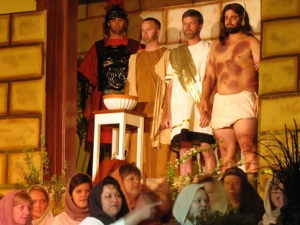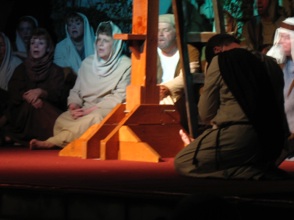 The base of the cross is quite the engineering feet! The actor lies on the cross, then it is raised into an upright position. Cleverly made metal hooks go around the crosspieces and look like they come out of the hands, but gives the actor handles to hold onto. To lower the body, the strip of cloth was first it was put under the actor’s arms, then over the cross piece. Some really strong men hold onto the ends of the cloth to gently lower the limp body while other strong men on the front finished lowering the body and lay him on the ground.