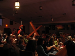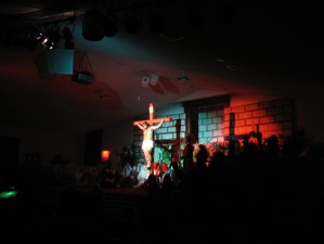 The aisle was used as a scene change for Jesus carrying the cross, and the choir/crowd was used as a curtain for raising the cross.