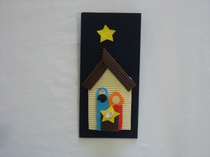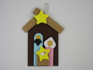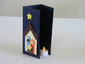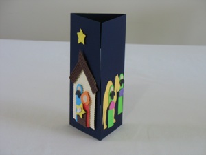 Fold a piece of black or navy blue card stock in thirds. Fasten a barn and figures to the front with glue stick or double stick tape.