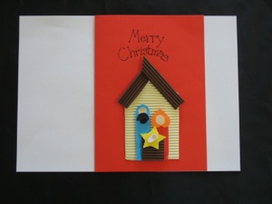 Fold a sheet of colored card stock in half. Trim half an inch (2 cm.) off of the bottom and side of the card (NOT the folded side, of course!) Hand write “Merry Christmas” on the front of the card, or write the message on your computer and print it out on your printer before folding and adding the paper embellishments. If you want the barn and figures to be a Christmas tree ornament, add a ribbon or thread to the barn, and write instructions for how to pull it off of the front of the card.