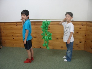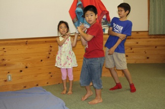 Let each child make his or her own bow and arrow with Q-tip arrows and plastic shopping handles (free at some stores in the bagging area, and sold at many hundred yen stores.) Tie thin elastic to the handles to make the bows.