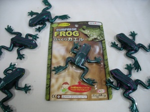 These frogs were purchased at a hundred yen store in the toy section, but they are only sold occasionally, so keep looking, or ask for them. They sort of feel like real frogs. Buy several if you ever do find them so that you can put them in different places around the room for kids to discover frogs everywhere--in their chairs, in the offering plate, on their snack plate, etc.