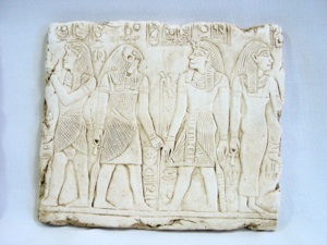 Any time egyptian looking objects are sold at hundred yen or dollar stores, stock up on a few. You can “bury” them in a box of sand, flour, or uncooked rice for children to pretend to be archeologists and discover “ancient” artifacts with a paint brush. Another option is to have them make rubbings by putting paper over the plaque and rubbing with the side of a crayon.