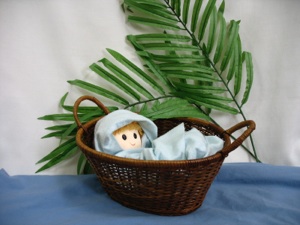 Any doll will work as long as it is wrapped up in a piece of cloth. For Moses, put the doll in a basket on a blue sheet (the river), and fake or real plants for young children to hide behind--you can have one child hide and report, another pull a string on the basket, and another be the princess who finds the baby. Then swap around roles.