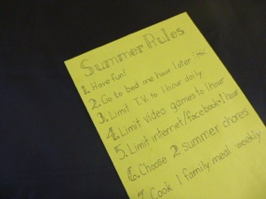 One way to introduce new summer rules is to start with things they will be excited about, like a later bedtime, or pizza once a week. Another way to get your kids to agree to these rules is to have a family meeting to decide the rules together. Obviously you are the parent, so you make the final decisions about what stays or goes.