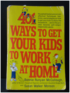 If you have no idea about what might be important to teach your children or what age to teach them, buy this book shown on the left, 401 Ways to Get Your Kids to Work at Home. It takes all the hard work out of trying to figure out what to teach when, since it has different household tasks broken down by the age that they can be expected to do these. If your kids object to learning these things, explain that it is part of growing up, and they need to learn these skills as preparation for becoming adults. Letting them choose from several options might help them embrace it, too. Also, limiting certain skills to ages, can add a “coming of age” element that makes them WANT to advance to the next level.