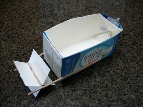 1.Glue the mouth of a milk or juice carton shut. The top of the carton now forms the prow (front)