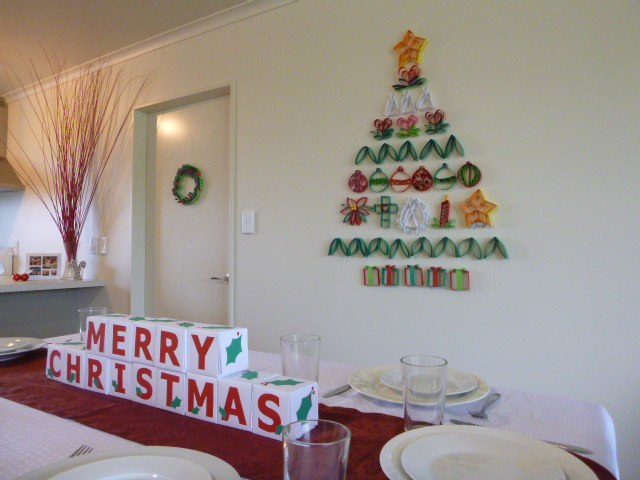 There are several ways to arrange the ornaments into a tree shape. In this photo, they are lined up in rows of similar shapes, with rows of leaves in between. Fasten them to the wall with mounting putty or masking tape so as not to pull the paint off the wall when you take them down.