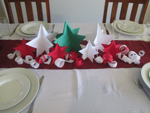 The centerpiece is made of lots of paper stars and paper curls. If you make a centerpiece with colored paper, be sure to test a small piece with water, to see if it bleeds. You do NOT want to ruin your tablecloth or table runner--all it takes is a spill or even a sweating pitcher to make the paper wet. To test the paper, simply wet a small scrap of colored paper and lay it on a paper towel for a few minutes. If the paper towel remains white, the paper does not bleed. See specific instructions for making the tree and centerpiece below