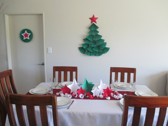 This tree is great for small apartments that don’t have space for a real tree, or for countries where it might be difficult to get a real or artificial tree. It makes a great background for a dining room. The “wreath” on the door is a disc of 4 sheets of green paper that have been glued end to end, then folded accordion style. Two paper stars were fastened in the middle.