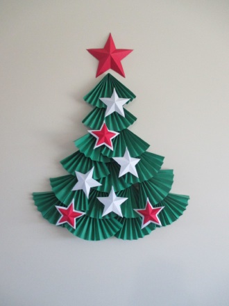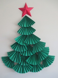 This Christmas tree is made of paper, so it is very inexpensive, and fairly quick to make. Fold green sheets of paper in accordion pleats. Then fold a red sheet of paper, and with one snip, it becomes a start. Simply fold to make the 3-D shape. These have all been fastened to the wall with Fun-Tack (wall mounting putty--there are lots of brands out there. Another option would be to mount the tree on a poster board or bulletin board.
