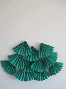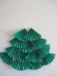 To make the tree, fold 15 sheets of green paper in accordion pleats. Start folding on the long side rather than the short side so the branches will be as long as possible. Fold in the middle, and glue the open edges together in the middle. Put the tree on the wall by starting with the bottom row up first, so that the rows above can layer on top.