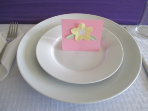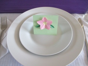 Mix and match the colors of the flowers and the place cards, and each person can have a different design. They may look like a lot of work, but once you fold the paper, it is only one or two snips with some scissors and the whole flower is cut out. It is fun to open it up and see what it is going to look like. Get the kids to help make them, and you will have heaps made in no time.