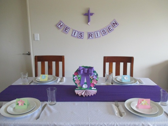 Easter decorations wouldn’t be complete without something to tell the real reason for the season. Make a 3-D paper cross out of 4 sheets of paper, or make a sign that proclaims, “He is risen!!” If you buy a sign, you are stuck with what someone else thinks of. If you make it yourself, you can make it say anything you want. Keep it short so it is quick to make and quick to read, and easy to remember.