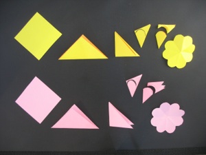 4.Cut the wide end of this folded triangle into a rounded shape, and open into a flower. Make these flowers ahead of class if the children can’t cut through so many layers of paper, or to save time. Use colored tissue paper to make the flowers easier to cut. See photo below.
