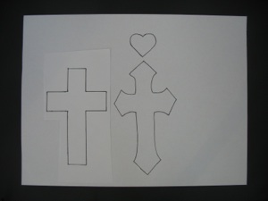 To save class time, do steps 1 and 2 ahead of time (make the shadow boxes, and cut out the crosses and hearts.) Then in class let the kids fasten the cross and hearts into the shadowboxes.