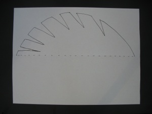 2.Cut the folded paper in a leaf shape--start cutting from next to the fold to form a point on the short end, and keep cutting toward the middle of the outer edge (NOT the folded edge), then back to a point next to the fold on the opposite short end.