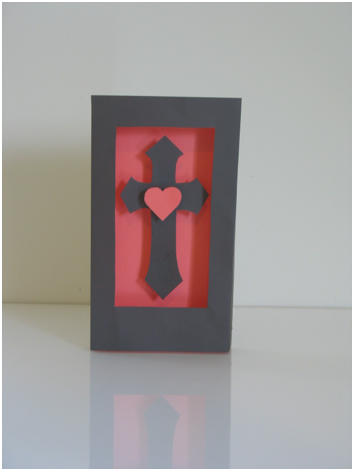 3.Fasten the heart to the cross, and then the cross to the shadowbox using foam style double stick tape, or make paper loops. (see link below for detailed instructions)