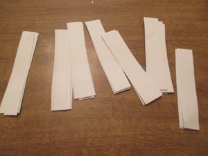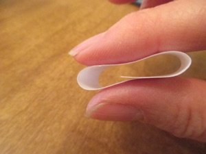 Pull the flattened ring into a ring again, and press it flat 1/8th inch away from the first fold. It should now form a narrow rectangle. Glue these to the back of the narrow letters, then glue the narrow letters onto the front of the thicker back letters. The rectangle “loops” will make the narrow letters stand out from the thicker background letters, and make it look more three dimensional.