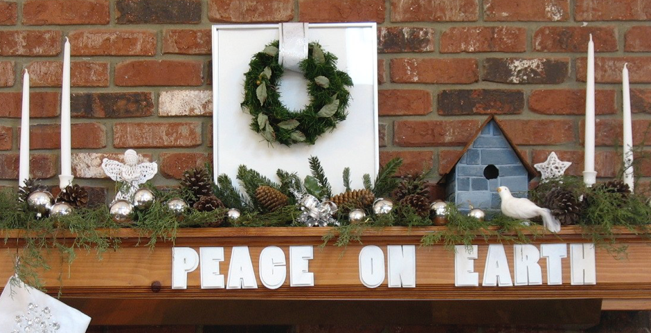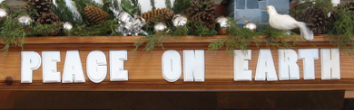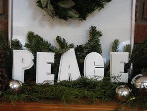 “Peace on Earth” is pretty long, so think about where you want to display these letters. You may prefer to just use the word, “Peace.” You can keep the letters of the word separate, and fasten them to the mantle with mounting putty (such as Fun-tack or Blue-tack) as shown in the photo above, or arrange in the greenery, which can be maddening to keep them from toppling!!