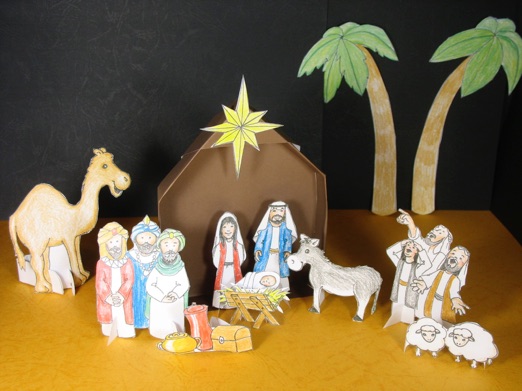 Print out the downloadable sheets (shown on right) to make the stable and 3 figures, (Mary, Joseph, and the baby Jesus,) for a craft that gets done quickly. If you want to make a bigger set with wisemen, shepherds and angels, too, see the photo and instructions below.