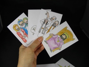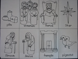 2.Discard the temple, pigeons, and staff. (these pictures are used for a Christmas card game--see 12 more ways to use these downloadable sheets on the right) Cut out all the remaining figures.