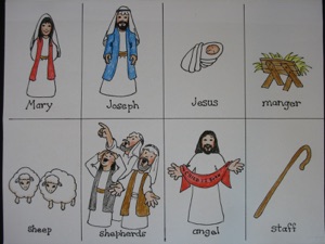 2.Print out the figure sheet, but only cut out the Mary, Joseph, baby, and manger. For sturdier figures, print on card stock, or glue them to thin cardboard such as a cereal box.