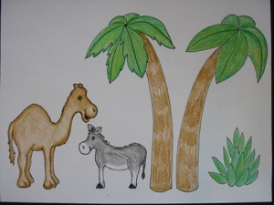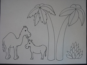 4.Optional background details: Print out the sheet including palm trees, camel, donkey, and plant. Cut out the figures, and glue to the background, or make stands. See the instructions for making stands under “stand-up figures” below. Glue trees to the background or to paper towel tubes. For an even more elaborate nativity scene, print out multiple sheets of background figures.