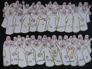 5.Optional angels: Print out the sheet with angels. Cut out the 2 groups of figures and glue to the background sky--put the top row on the left, and the bottom row on the right side of the scene. If you would like to have a “reveal” so lots of angels appear, glue the angels to a flap fastened to the background sky so when you lift the flap, all the angels appear. (make sure the angels are glued on so they appear upright when flipped up!) (Most scenes only have one angel, which only tells part of the story. I spent lots of time drawing lots of angels so you could tell the whole story! See a photo including the angels by clicking on the 12 more options below.)