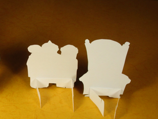 4.Glue the middle section of the strips against the backs of the figures, then unfold so the figures stand. (fold flat for storage.) If you want the figures to lean back slightly, cut a very thin wedge from the bottom of both sides of the stand.