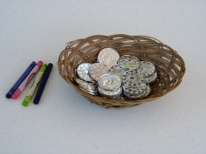 The children are given a crayon and plastic coin to make a rubbing of it. It would be more exciting to get a coin, especially if it were chocolate wrapped in foil! If plastic or chocolate coins are not available, you could give out real silver coins, if they are not worth much (American 5 cent or Japanese one yen are perfect.)