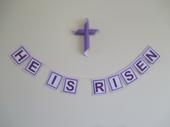 This banner proclaims the good news that tells why Easter is the most important day in all of history. Other options for words might be “Jesus is alive!” or “Hallelujah ,“ or even “Happy Day!”
