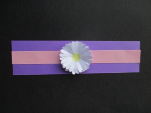 Glue the pink strip to the purple strip. Glue the 2 layers of daisy together. Glue the flower in the middle of the pink strip. Glue the yellow circle to the middle of the daisy.
