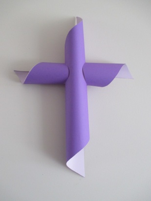 This 3-D cross is actually made out of 4 sheets of paper. Download the pattern, cut out the 2 shapes, glue them into 2 tubes, then squeeze them together. It is light weight, so easy to hang on a wall or bulletin board.