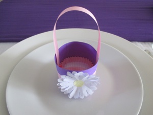 Dress up white candles for Easter with a sleeve of purple paper. Add paper doilies and tie it all on with pastel ribbons. Just make sure that the candles don’t burn down to the paper since this can be a fire hazard. Another option is to burn the candles down to where a tea light can fit in the melted area. Pour out any excess wax and put a tea light with metal liner in the hole. Then it will only burn as far as the metal liner. It can keep your pillar candle lasting longer since you can keep replacing the tea light when it runs out. Optional: Add some pink paper hearts with a bit more ribbon tied in with the bow on the middle candle.